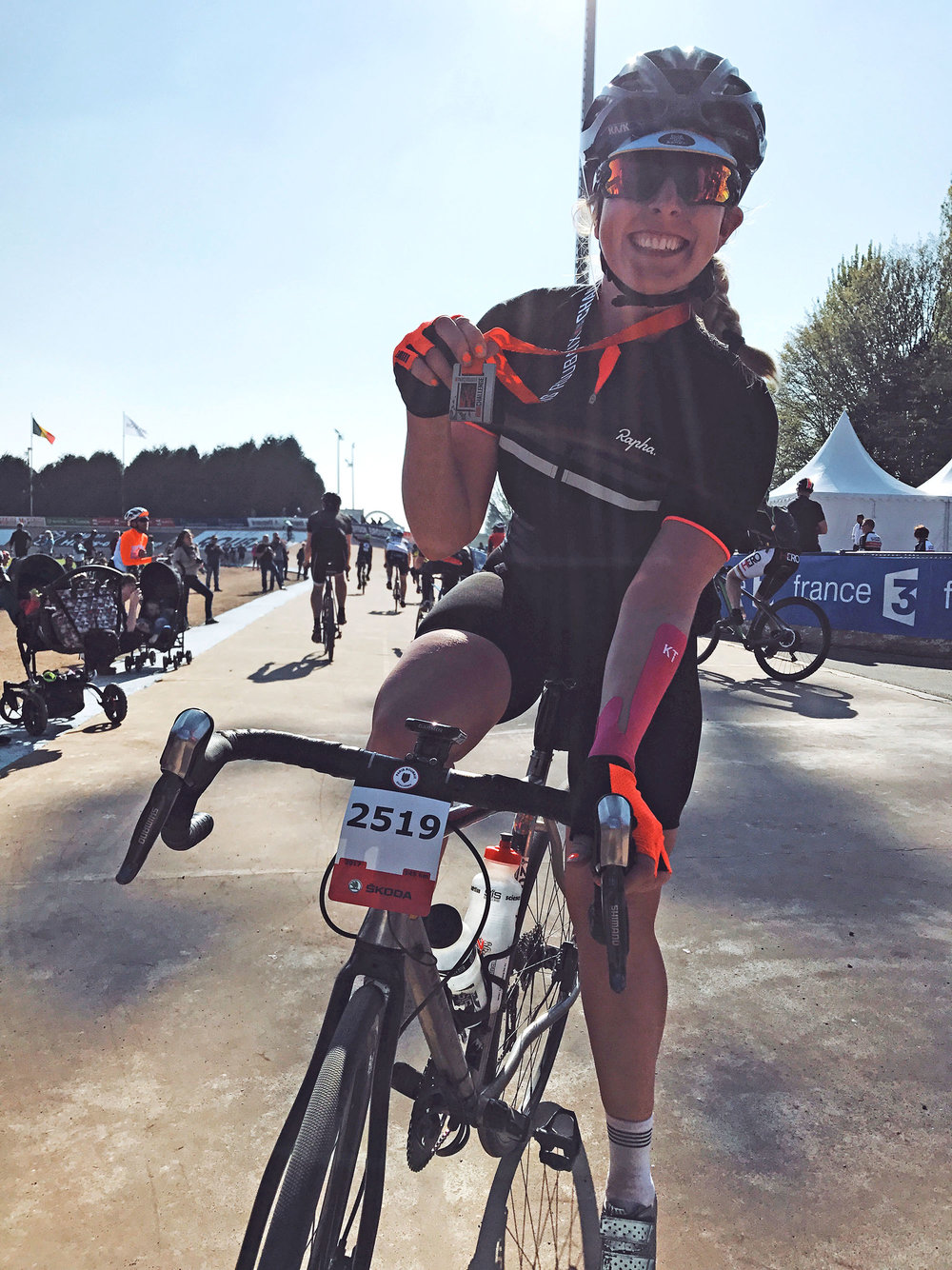Then I hit it! The first cobbled section you're dropped into is the infamous Trouee d’Arenberg. It was chaos and carnage all around me as I hit the cobbles, but I loved it and found an unexpected rhythm and pleasure in smashing it as hard as I could. My heart rate felt like it was at max and I could hear myself breathing, but despite the drama, energy and bone shaking, the event photographer who was stationed there captured my feelings exactly – I had the biggest cheesiest grin on my face the whole time!